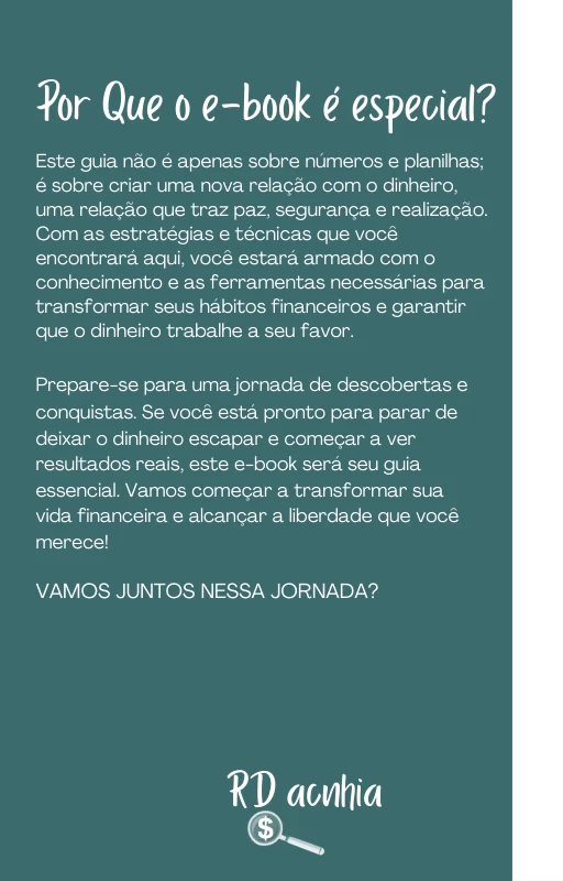 Com as estratégias e técnicas que você encontrará aqui, você estará armado com o conhecimento e as ferramentas necessárias para transformar seus hábitos financeiros e garantir que o dinheiro trabalhe a seu favor.